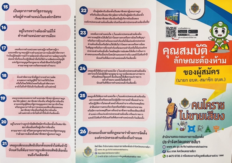 >>ผู้ที่ประสงค์จะลงสมัครนายก อบต. และสมาชิกสภา อบต. อย่าลืมตรวจสอบคุณสมบัติและลักษณะต้องห้ามของตนเอง ก่อนลงสมัคร