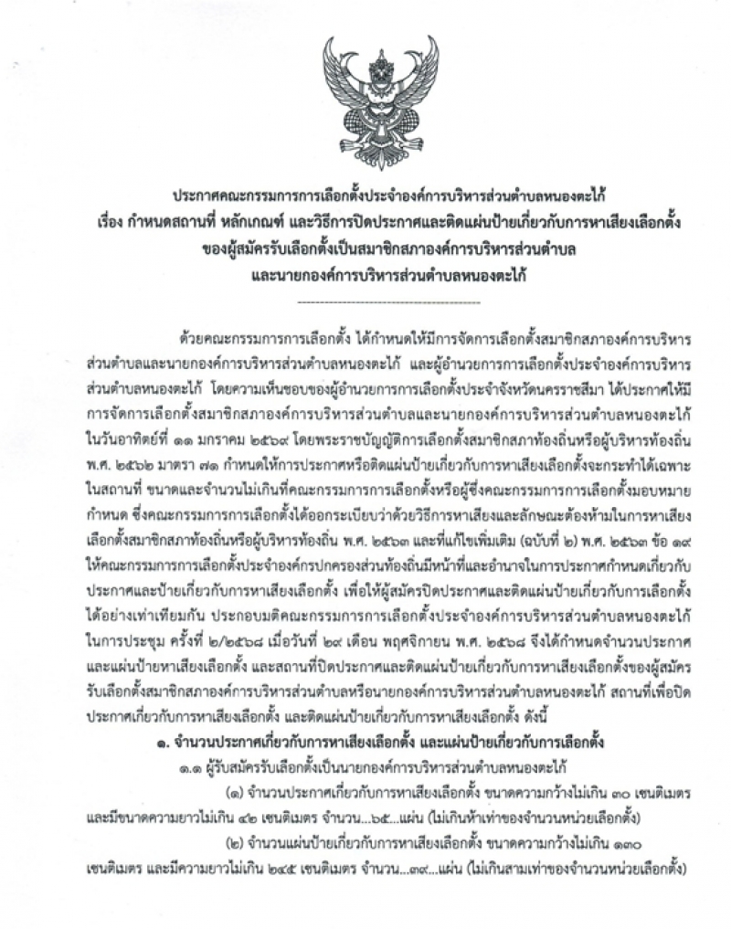 ประกาศเรื่อง กำหนดหลักเกณฑ์ วิธีการปิดประกาศและติดแผ่นป้ายเกี่ยวกับการหาเสียงเลือกตั้ง ในการเลือกตั้งสมาชิกสภาองค์การบริหารส่วนตำบลและนายกองค์การบริหารส่วนตำบลหนองตะไก้