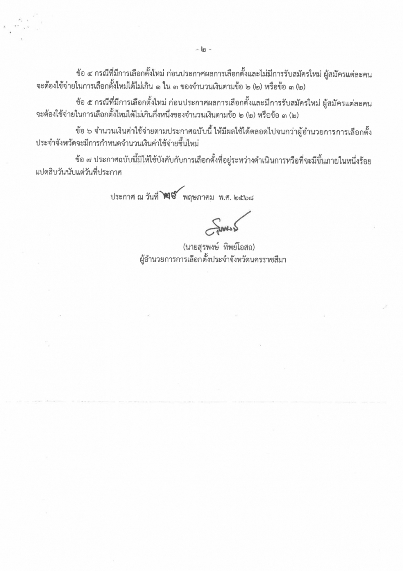 ประกาศ ผู้อำนวยการการเลือกตั้งประจำจังหวัดนครราชสีมา เรื่อง การกำหนดจำนวนเงินค่าใช้จ่ายในการเลือกตั้งของผู้สมัครรับเลือกตั้งเป็นนายกและสมาชิกสภาองค์การบริหารส่วนตำบล