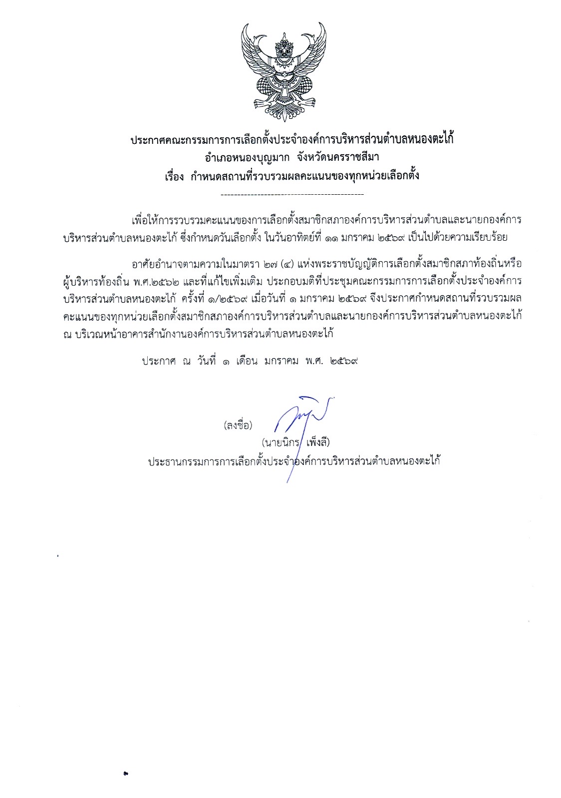 ประกาศคณะกรรมการการเลือกตั้งประจำองค์การบริหารตำบลหนองตะไก้ เรื่อง กำหนดสถานที่รวบรวมผลคะแนนของทุกหน่วยเลือกตั้ง