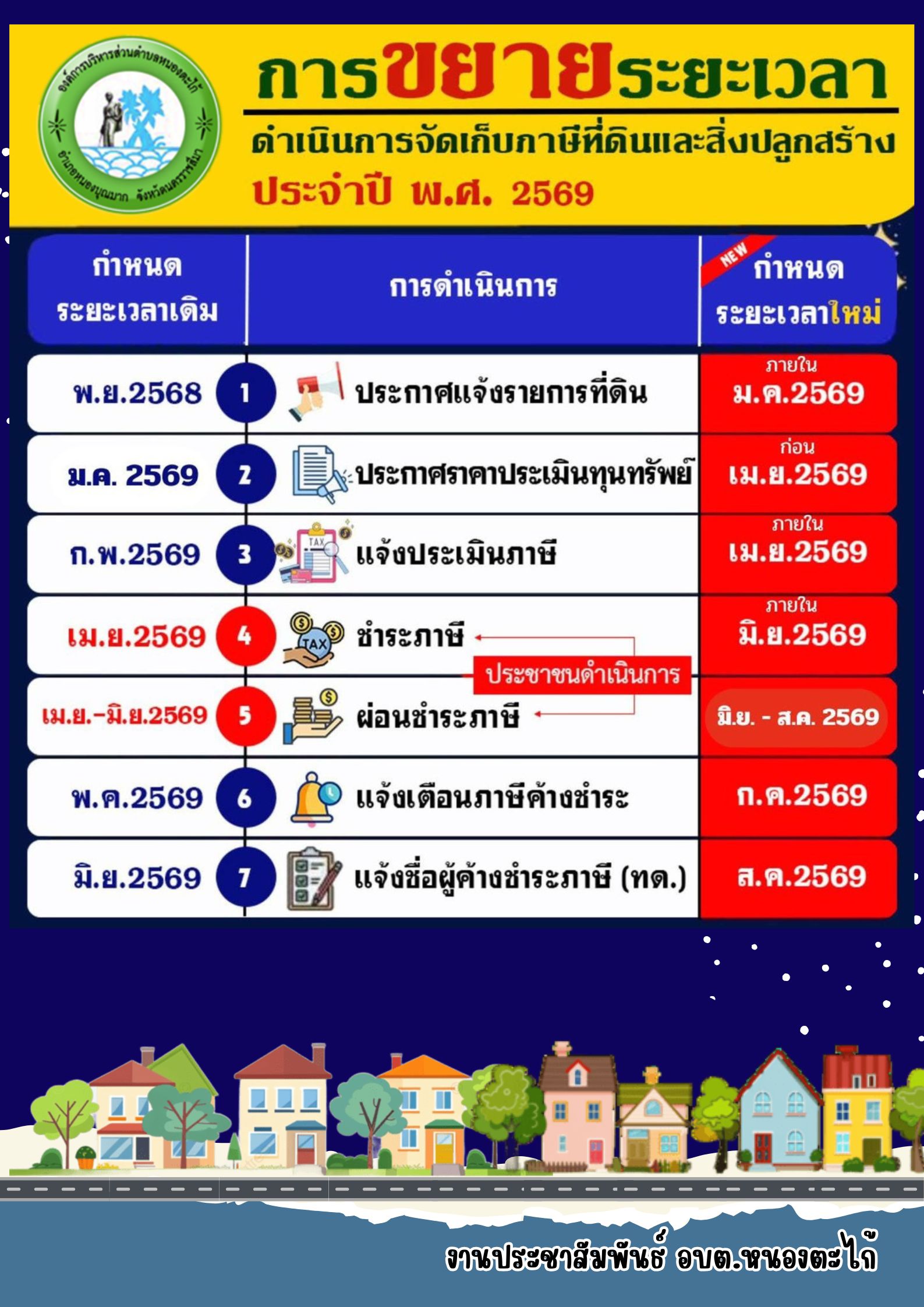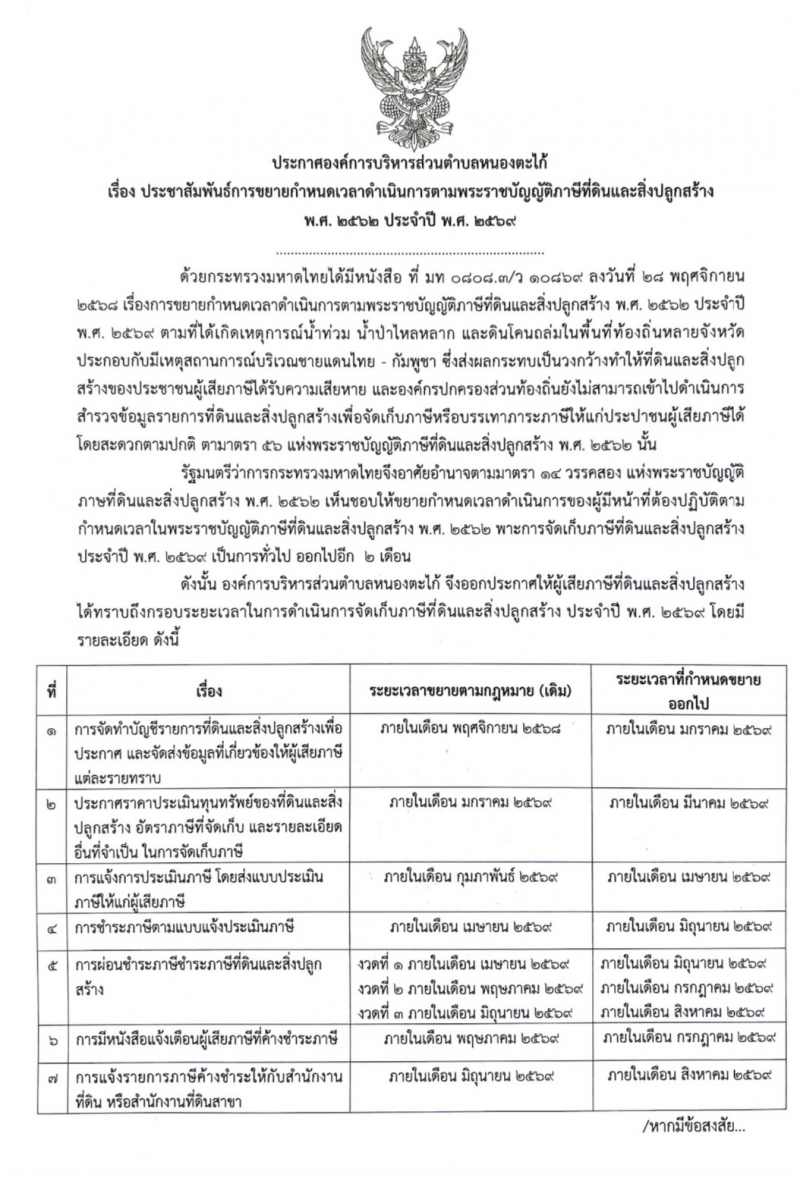 องค์การบริหารส่วนตำบลหนองตะไก้ ขอแจ้ง ขยายระยะเวลา การดำเนินงานภาษีที่ดินและสิ่งปลูกสร้าง ดังนี้