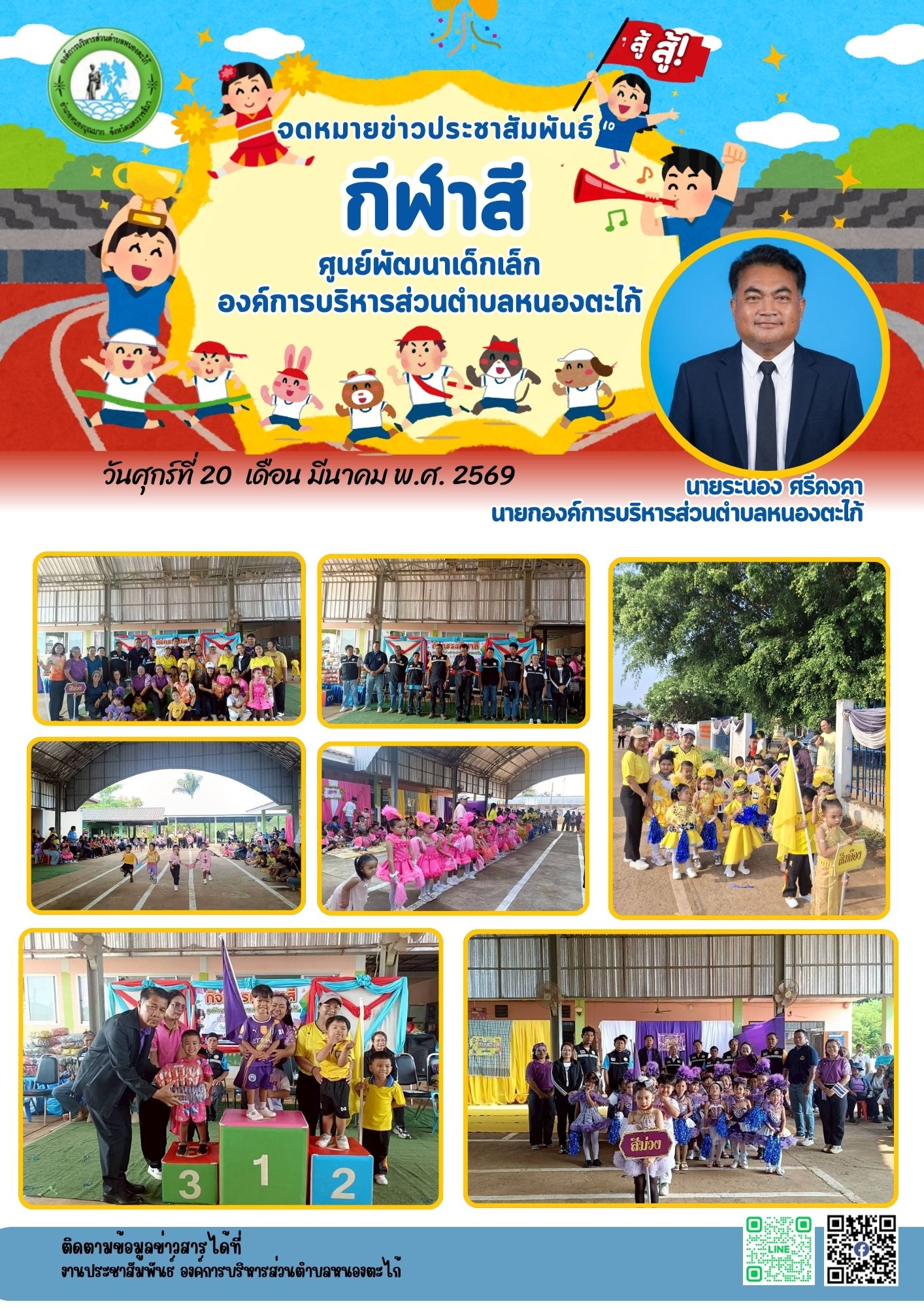 วันศุกร์ที่ 20 มีนาคม 2569 เวลา 08.30 น. ศูนย์พัฒนาเด็กเล็กองค์การบริหารส่วนตำบลหนองตะไก้ ไุึด้จัดกิจกรรมการแข่งขันกีฬาสีศูนย์พัฒนาเด็กเล็กองค์การบริหารส่วนตำบลหนองตะไก้ โดยได้รับความร่วมมือระหว่างผู้ปกครองและชุมชน มีวัตถุประสงค์เพื่อให้เด็กปฐมวัยได้ออกกำลังกายมีสุขภาพและพลานามัยที่สมบูรณ์แข็งแรง ใช้เวลาว่างให้เป็นประโยชน์ส่งเสริมสนับสนุนการกีฬาและปลูกจิตสำนึกให้เด็กปฐมวัยรักการออกกำลังกาย💗💗